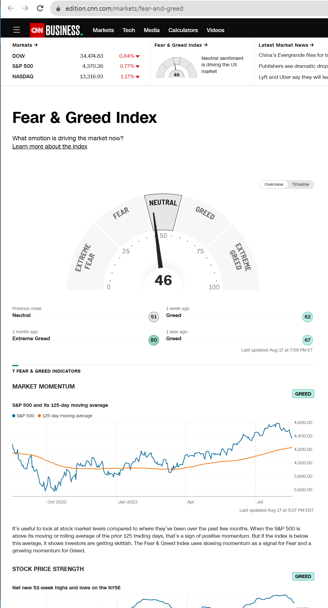 공포와 탐욕 지수로 유명하고 주식 시장의 과열 상태를 알아볼 수 있는 대표적인 지표 중에 하나로 Fear and Greed Index 가 있습니다. - 과매수 구간에 들어가면 Greed, Extreme Greed 로 지표값이 상승하고, - 과매도 구간에 들어가면 Fear, Extreme Fear 로 지표값이 하락합니다. - 지표 주소 : https://edition.cnn.com/markets/fear-and-greed 상세한 데이터는 제공되는 페이지 하단에 이어서 제공 되고 있지만, 지수 추종으로 Long 방향으로 주식을 매수하는 입장에서 이 지표를 활용하는데에는 Fear, Extreme Fear 지수가 유용하게 쓰일 수 있습니다. - 미국 주식 매매시 활용 떨어지는 칼날을 잡지 말라는 격언이 있긴 하..